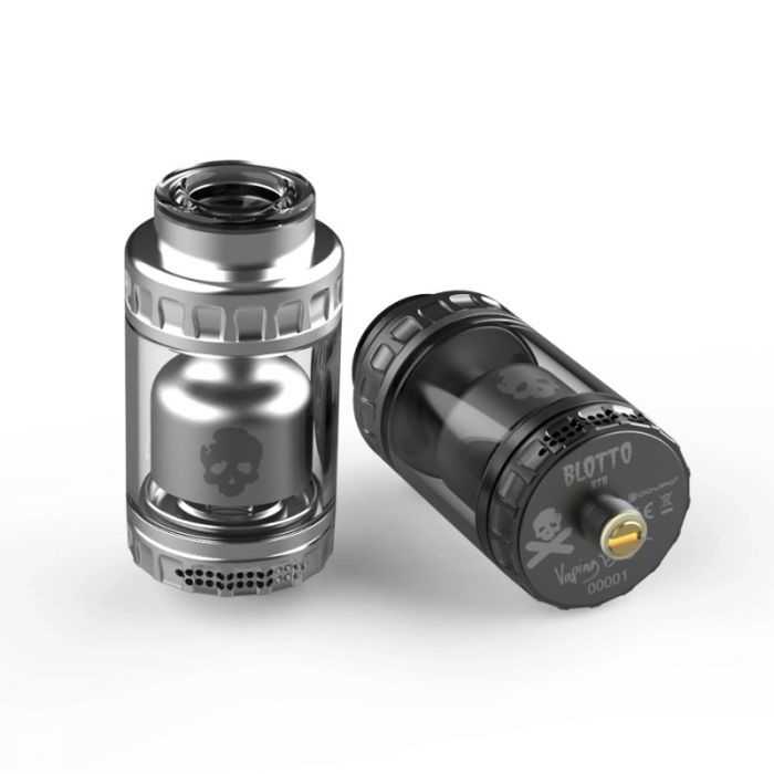 Du point de vue esthétique, il ne ressemble pas aux habituels clearomiseurs et RTA modernes grâce à des ornements physiques particuliers. En l’occurrence, le Blotto est similaire à n’importe quel clearomiseur vu de loin, mais se distinguera par ses 52 petits trous sur la base, son petit crâne fissuré imprimé sur la cheminée, et les stries physiques destinées à optimiser la prise en main sur l’airflow et le top cap.