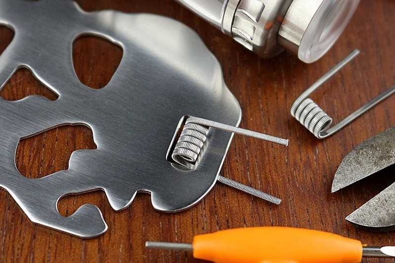 L’espace de montage quant à lui est assez large pour recevoir un dual coil de 3mm. Si vous ne disposez pas d’outils de mesure adéquats pour connaitre le diamètre compatible, un petit outil multifonction (ouvre-bouteille, coupeur de tige) en forme de crâne fissuré vous guidera à travers une petite règle rectangulaire (la dimension de la résistance ne doit pas dépasser la largeur t la longueur de ce rectangle).