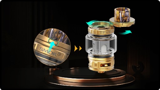 Comme d'habitude, Smok a équipé son TFV18 de son système de remplissage topfill, simple, efficace, pourquoi changer ? Il vous suffira d'appuyer comme ci-dessus sur le bouton au niveau du top-cap pour déverouiller l'ouverture, vous pourrez de cette façon effectuer une rotation du top-cap pour accéder au réservoir de 7.5ml.
