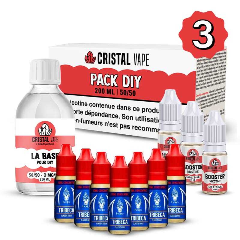 Pack DIY Tribeca 270ml conçu pour réaliser votre mélange simplement. Ce pack est composé de 7 concentrés Tribeca de Halo et d'un Pack DIY 50/50 200ml de Revolute contenant de la base neutre et des boosters de nicotine.