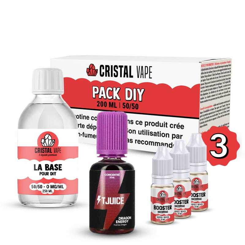 Pack DIY Dragon Energy 230ml conçu pour réaliser votre mélange simplement. Ce pack est composé du concentré Dragon Energy 30ml et d'un Pack DIY 50/50 200ml de Cristal Vape contenant de la base neutre et des boosters de nicotine.