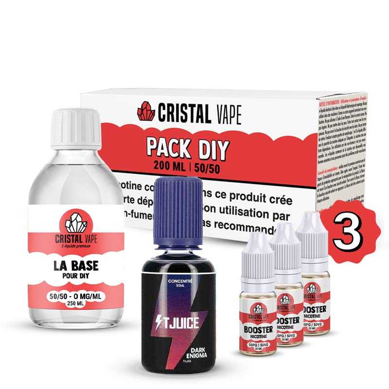 Pack DIY Dark Enigma 230ml conçu pour réaliser votre mélange simplement. Ce pack est composé du concentré Dark Enigma 30ml et d'un Pack DIY 50/50 200ml de Cristal Vape contenant de la base neutre et des boosters de nicotine.