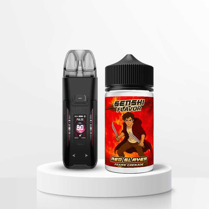 Le pack associe le Luxe XR Max 2 et l’e-liquide Red Slayer 200ml (fraise, grenade, frais) pour une configuration complète pensée pour une vape puissante et polyvalente.