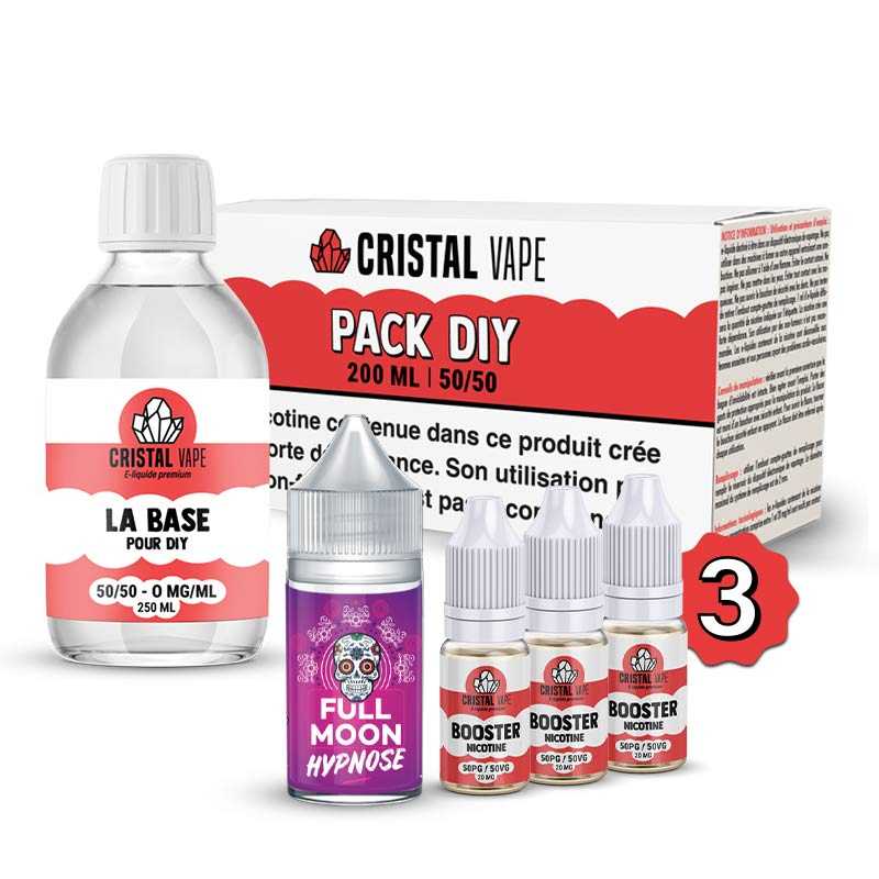 Pack DIY Hypnose 230ml conçu pour réaliser votre mélange simplement. Ce pack est composé du concentré Hypnose 30ml de Full Moon et d'un Pack DIY 50/50 200ml de Cristal Vape contenant de la base neutre et des boosters de nicotine.