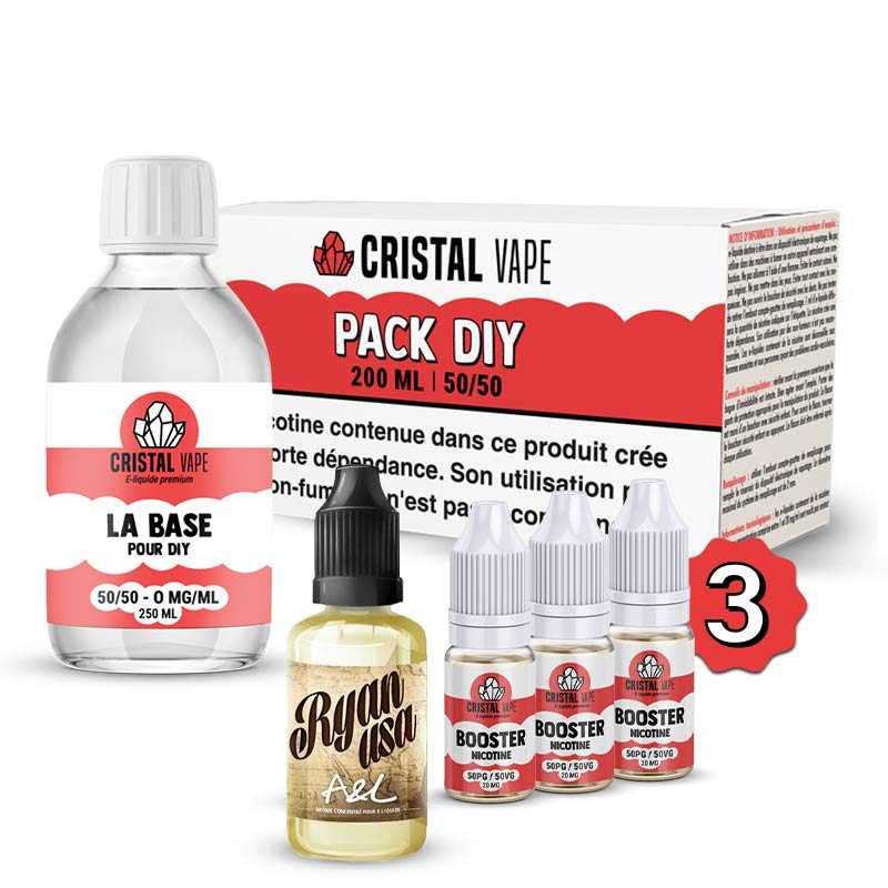 Pack DIY Ryan USA 230ml conçu pour réaliser votre mélange simplement. Ce pack est composé du concentré Ryan USA 30ml de A&L et d'un Pack DIY 50/50 200ml de Cristal Vape contenant de la base neutre et des boosters de nicotine.