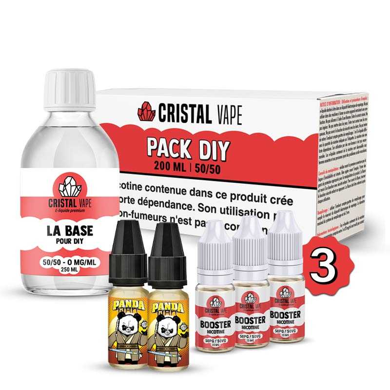 Pack DIY Panda Wan 220ml conçu pour réaliser votre mélange simplement. Ce pack est composé de 2 concentrés Panda Wan 10ml de A&L et d'un Pack DIY 50/50 200ml de Cristal Vape contenant de la base neutre et des boosters de nicotine.