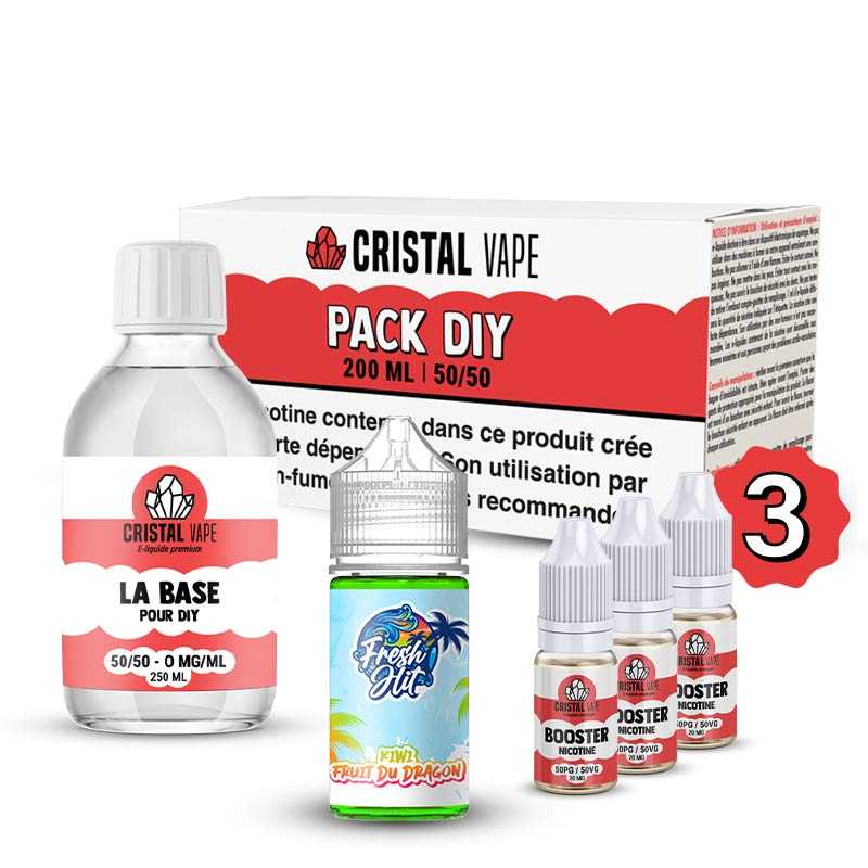 Pack DIY Kiwi Fruit du Dragon 230ml conçu pour réaliser votre mélange simplement. Ce pack est composé du concentré Kiwi Fruit du Dragon 30ml de Fresh Hit et d'un Pack DIY 50/50 200ml de Cristal Vape contenant de la base neutre et des boosters de nicotine.
