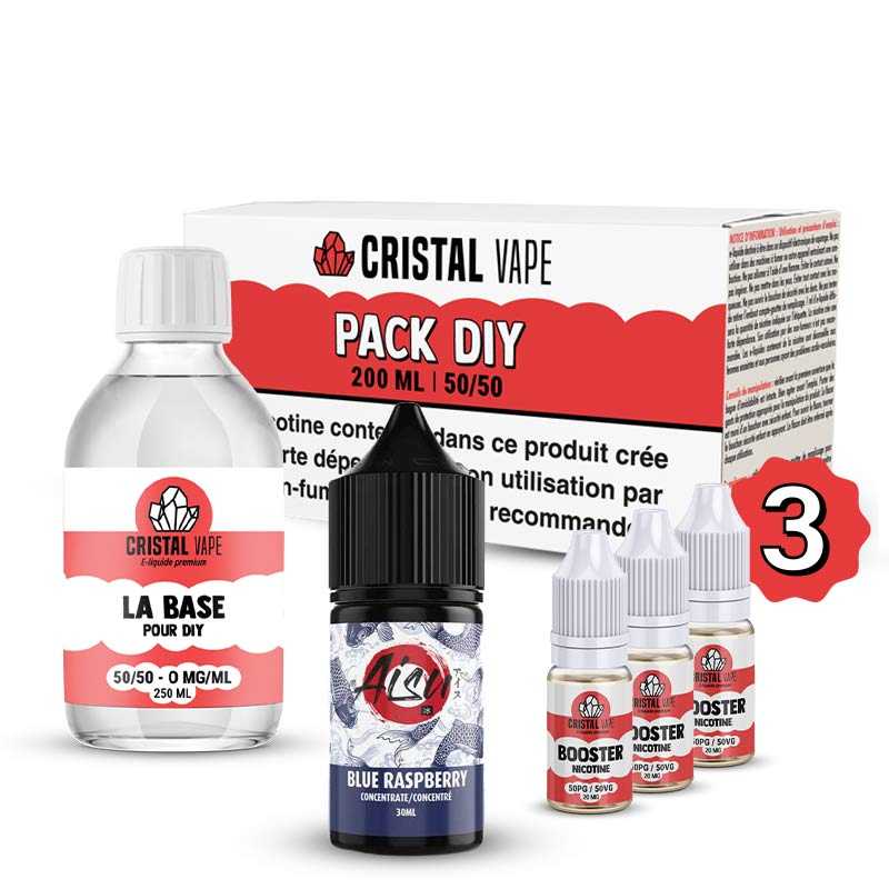 Pack DIY Blue Raspberry 230ml conçu pour réaliser votre mélange simplement. Ce pack est composé du concentré Blue Raspberry 30ml de Aisu Zap Juice et d'un Pack DIY 50/50 200ml de Cristal Vape contenant de la base neutre et des boosters de nicotine.