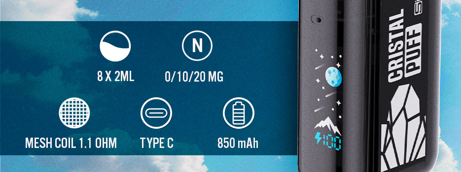 Dotée d’une autonomie impressionnante allant jusqu’à 28 000 bouffées, la Cristal Puff se distingue par son ingénieux système à capsules interchangeables : elle contient 8 capsules (pods) de 2 ml d'e-liquide aux sels de nicotine, soit 16 ml au total. Le pod embarque une cartouche avec résistance Mesh de 1,1 Ω, garantissant une vapeur riche et des saveurs intenses.