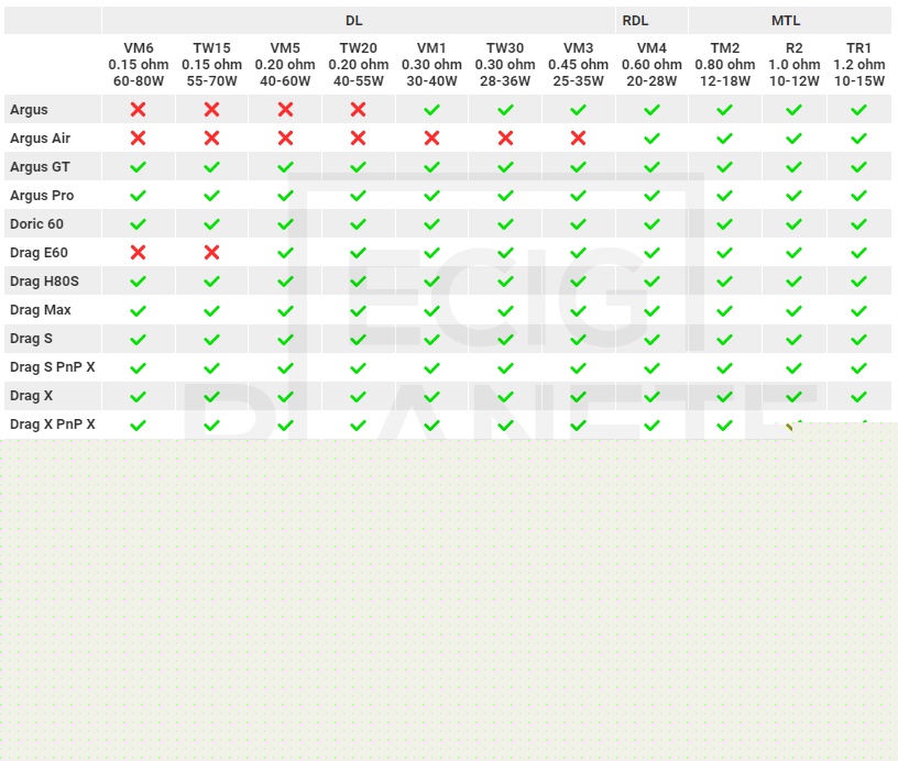 Afin d'éviter les fuites, nous vous recommandons d'utiliser pour les résistances "DL" pour les e-liquides dont le taux de glycérine végétale est supérieur ou égal à 60% et 50% pour les résistances "RDL" et "MTL".